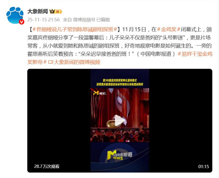 朵朵曾一脸认真地追问佟丽娅:“妈妈,你为什么爱电影?”主动要求了解电影制作的方方面面。这波“职业启蒙”来得如此自然,连霍思燕都忍不住当场预言:“我觉得朵朵早晚接爸爸的班!”台下镜头立刻捕捉到陈思诚——这位刚凭《唐探1900》斩获金鸡奖最佳导演、同时手握“年度导演”“年度监制”头衔的爹,笑得眼睛都没了,满脸写着“吾家有儿初长成”。