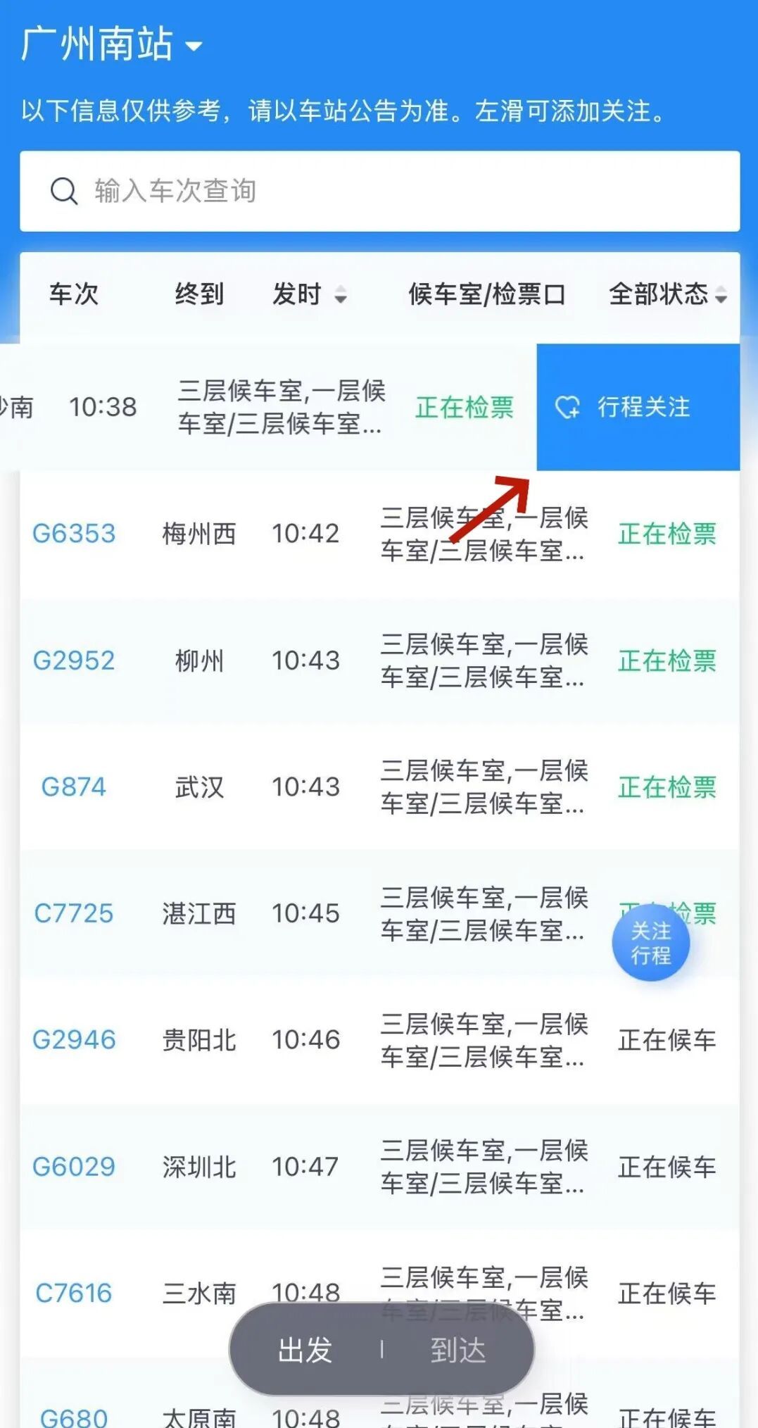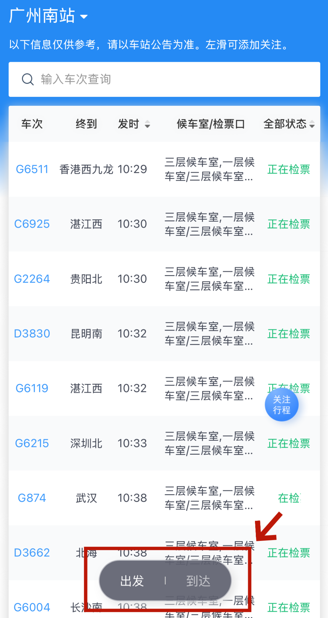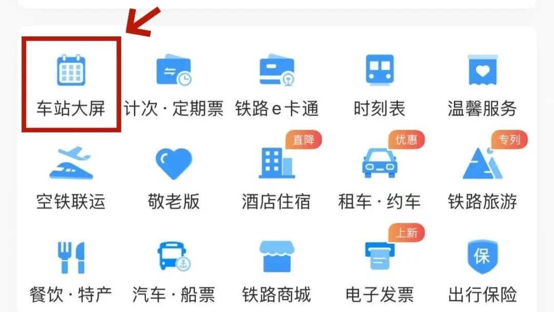 打开铁路12306App首页,点击“车站大屏”,可以了解各个车站的实时列车信息。“出发”和“到达”两个选项分别对应列车的“进站信息”和“出站信息”。